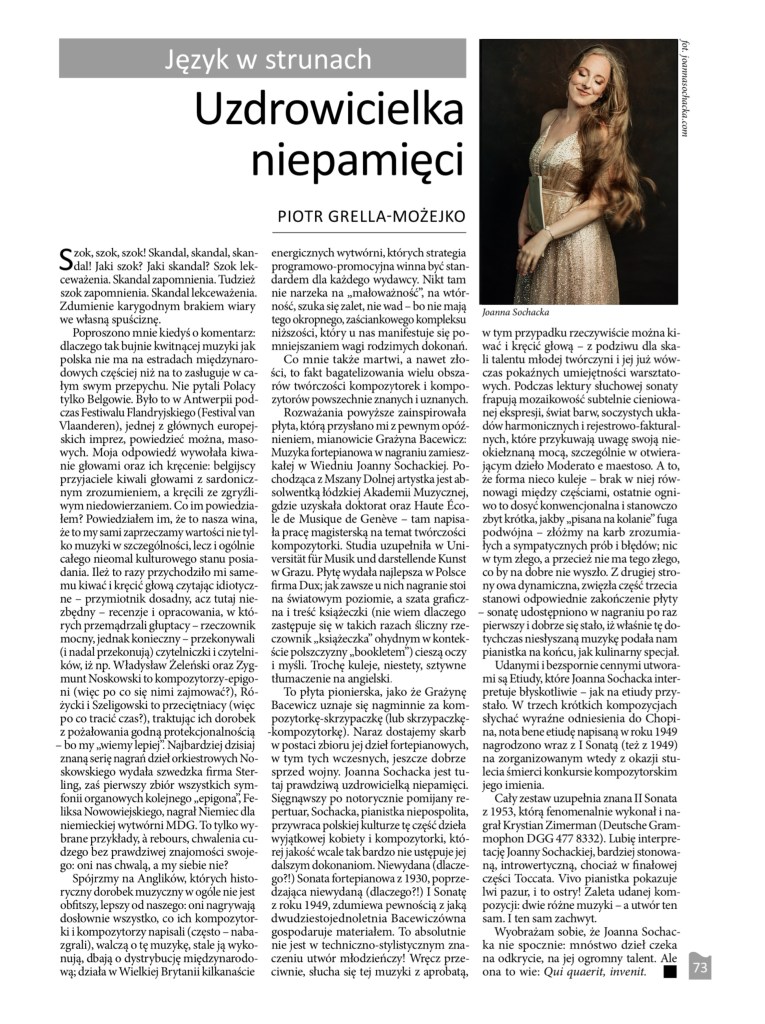 The newest column in my cycle “Tongue in Strings”, which I publish in the monthly “Śląsk” [Silesia/Schlesien] is about the highly talented pianist, Joanna Sochacka (“Śląsk”, No. 312, September 2021, p. 73).